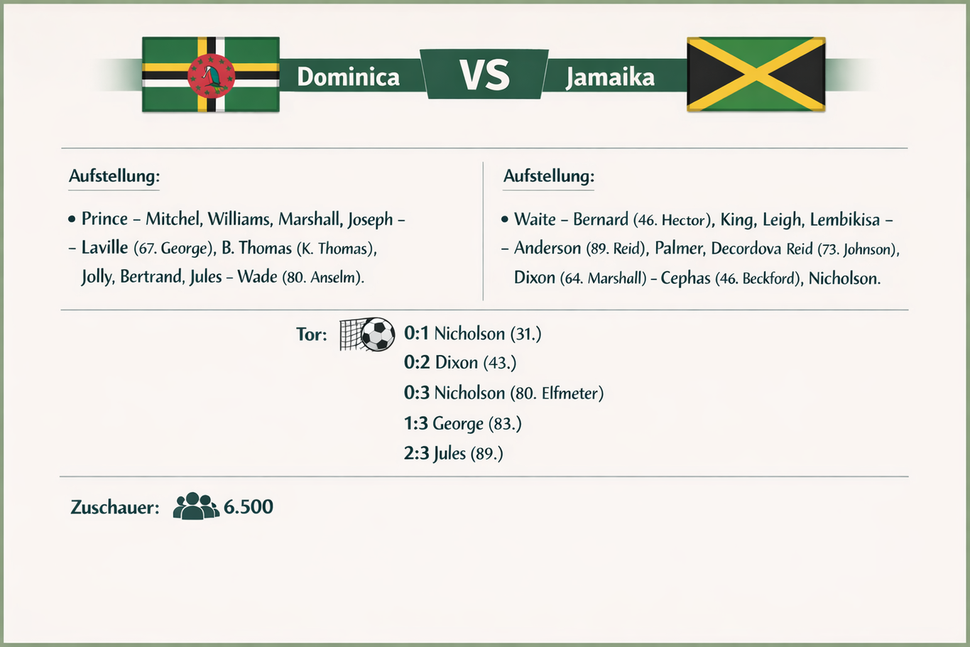 Nicholson und Dixon setzten die Dominica-Verteidigung weiterhin unter Druck, und der erstgenannte kam in der 34. Minute fast zum zweiten Tor, doch sein Schuss wurde von einem Verteidiger abgeblockt.