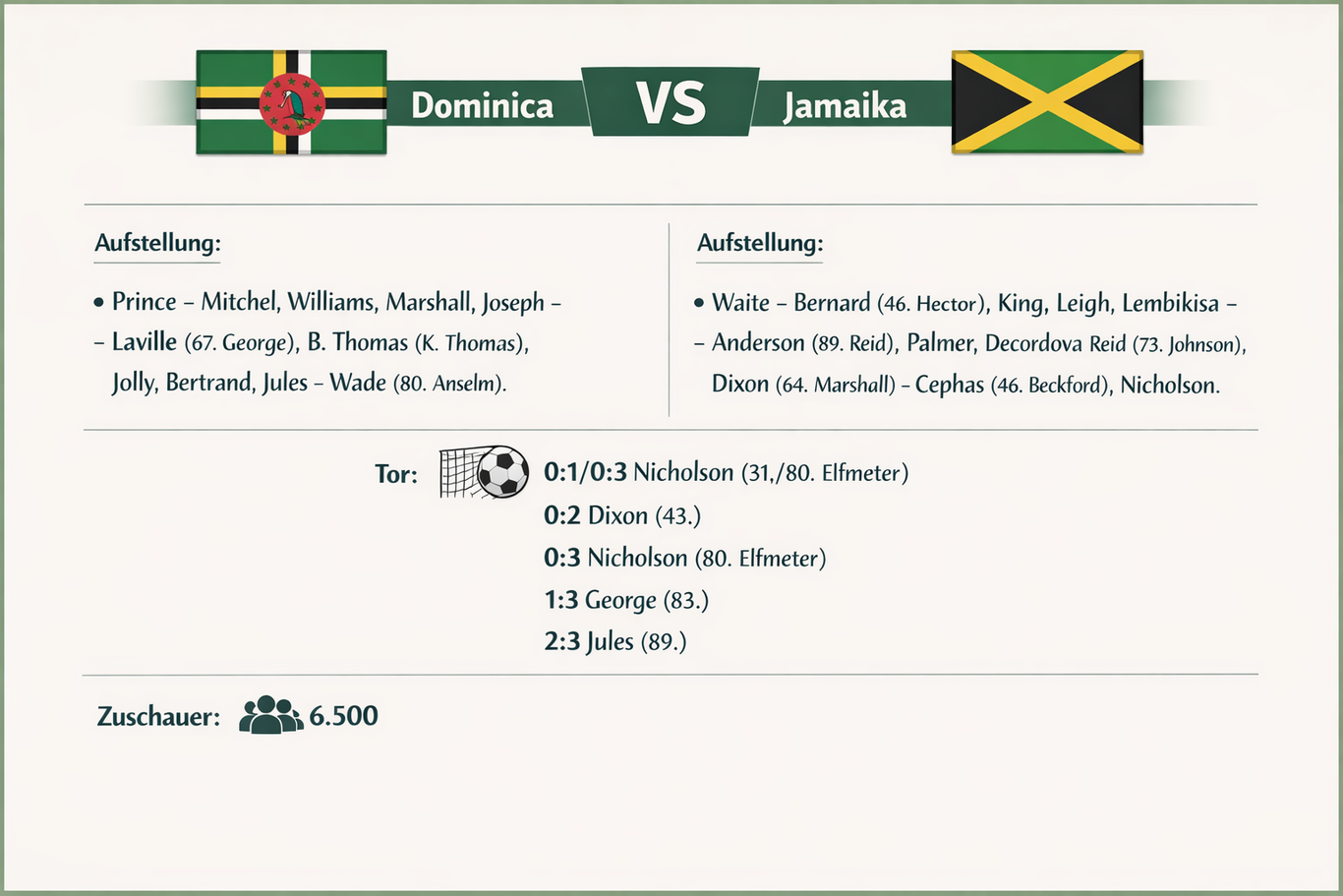 Nicholson und Dixon setzten die Dominica-Verteidigung weiterhin unter Druck, und der erstgenannte kam in der 34. Minute fast zum zweiten Tor, doch sein Schuss wurde von einem Verteidiger abgeblockt.